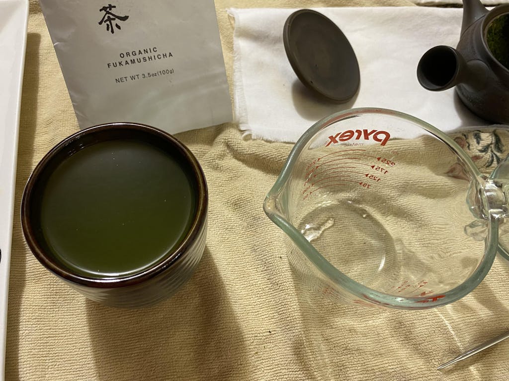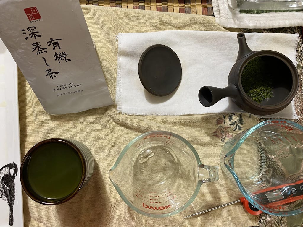 I would also note that, due to the very small leaves of the Fukamushi Sencha as a result of the steaming process involved with it, depending on what kind of teapot/kyusu you use, cleaning your teapot/kyusu might take a bit more of a determined effort than usual, in-terms of using only warm water to rinse out your teapot/kyusu (In the case of unglazed clay teapot/kyusu, don't use soap, since the interior of the unglazed clay teapot/kyusu may very well absorb the soapy water, and can negatively impact any future brews in that said unglazed clay teapot/kyusu), so that's something to keep in-mind, depending on what kind of teapot/kyusu you use.